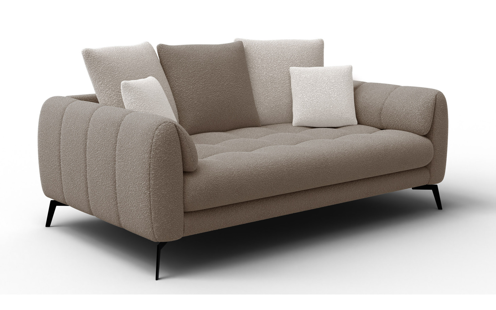 Sofa 2,5-Sitzer CALME, beige und écru - Beschreibung:Wenn Sie auf der Suche nach einem Möbelstück sind, das moderne Ästhetik mit unübertroffenem Komfort verbindet, ist das Sofa 2,5-Sitzer CALME, beige und écru eine unvergleichliche Wahl für Ihr Zuhause. Dieses exquisite Sitzmöbel definiert den Begriff der Gemütlichkeit völlig neu und besticht durch seine außergewöhnlich weiche, strukturierte Oberfläche. Der verwendete Bouclé-Stoff ist nicht nur ein optisches Highlight, sondern auch ein haptischer Genuss für die Sinne. Mit seiner klaren, flauschigen Textur lädt er dazu ein, sich fallen zu lassen und den Alltag hinter sich zu lassen. Die helle, freundliche Farbkombination aus Beige und Écru verleiht jedem Raum eine traumhafte Leichtigkeit und sorgt für eine Atmosphäre purer Entspannung. Das Design dieses Sofas spielt gekonnt mit Kontrasten. Während die Grundform minimalistisch und fließend gehalten ist, sorgen die üppigen, weichen Kissen für eine fast gepolsterte Wand, die Geborgenheit ausstrahlt. Es ist diese harmonische Verbindung aus strenger Linie und einladender Weichheit, die das Möbelstück so besonders macht. Sie werden spüren, wie die verschiedenen Nuancen innerhalb der hellen Farbpalette dem Raum Tiefe und Wärme verleihen, ohne dabei aufdringlich zu wirken. Warum das Sofa 2,5-Sitzer CALME, beige und écru die perfekte Wahl für Ihr Interieur istEin entscheidender Faktor für den überragenden Sitzkomfort im Sofa 2,5-Sitzer CALME, beige und écru ist der aufwendige Aufbau der Polsterung. Mehrere Schaumstoffschichten unterschiedlicher Dichte arbeiten perfekt zusammen, um Ihnen ein langlebiges und bequemes Sitzerlebnis zu garantieren. Doch das wahre Geheimnis liegt in den Rückenkissen. Diese sind mit speziellen Silikonfasern gefüllt, die für einen außergewöhnlichen Komfort sorgen, der Sie wie auf Wolken schweben lässt. Die weit auseinander liegenden Kissen ermöglichen es Ihnen zudem, die Unterstützung für Rücken und Schultern ganz nach Ihren persönlichen Vorlieben anzupassen. Egal ob Sie aufrecht sitzen und ein Buch lesen oder sich entspannt zurücklehnen möchten, dieses Sofa passt sich Ihren Bedürfnissen an. Es schafft eine gemütliche Atmosphäre, die zum Verweilen einlädt und jeden Abend zu einem kleinen Wellness-Erlebnis in den eigenen vier Wänden macht. Auch die geschwungenen Linien der Armlehnen tragen maßgeblich zum Komfort bei. Sie verleihen der Form nicht nur eine elegante Fluidität, sondern bieten auch eine angenehme Stütze beim Anlehnen. Jedes Detail an diesem Design Sofa ist durchdacht, um Ihnen maximale Erholung zu bieten. Das exklusive Design und die Verarbeitung des Sofa 2,5-Sitzer CALME, beige und écruNeben dem Komfort überzeugt das Sofa 2,5-Sitzer CALME, beige und écru auch durch seine standfeste und dennoch filigrane Konstruktion. Die schlanken, schwarzen Metallfüße mit einer Höhe von 16 cm verleihen dem Sofa eine optische Leichtigkeit, die es fast im Raum schweben lässt. Diese erhöhte Struktur verbessert nicht nur die Proportionen des Möbels, sondern erleichtert auch die Reinigung des Bodens darunter erheblich. Der Bouclé-Bezug ist zudem äußerst praktisch. Er ist angenehm anzufassen, knitterfrei und behält auch bei intensiver Nutzung seine Form und Schönheit. Die Kombination aus der robusten Verarbeitung und dem luxuriösen Stoff macht dieses Sofa zu einem langlebigen Begleiter. Es ist ein wahres Meisterwerk der Handwerkskunst, das Modernität und Behaglichkeit in einer Weise vereint, die Sie jeden Tag aufs Neue begeistern wird. Lassen Sie sich von der Qualität und dem Design dieses außergewöhnlichen Möbelstücks überzeugen. Es ist nicht einfach nur ein Sofa, sondern ein Ort der Ruhe, an dem Sie Kraft tanken können. Holen Sie sich mit diesem Modell zeitlose Eleganz und traumhaften Komfort direkt in Ihr Wohnzimmer. |