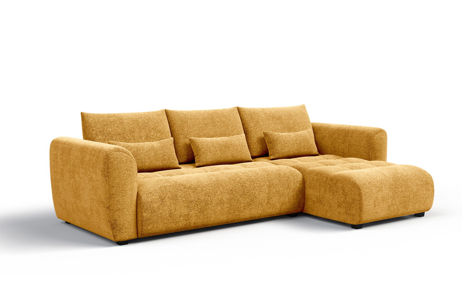 Ecksofa 4-Sitzer rechts SORENO, gelb - Beschreibung:Bringen Sie Sonnenschein und Lebensfreude in Ihr Zuhause mit dem Ecksofa 4-Sitzer rechts SORENO, gelb. Dieses außergewöhnliche Möbelstück ist ein echter Stimmungsaufheller und verwandelt jedes Wohnzimmer in einen Ort voller Energie und Wärme. Die leuchtende gelbe Farbe setzt ein mutiges, fröhliches Statement und harmoniert wunderbar mit der modernen, organischen Formensprache des Sofas. Sanft abgerundete Ecken und fließende Linien nehmen dem kräftigen Farbton die Strenge und sorgen für eine weiche, einladende Optik, die sofort sympathisch wirkt. Das Design ist puristisch und doch verspielt, ideal für alle, die Individualität und Optimismus in ihrer Einrichtung ausdrücken möchten. Es ist nicht nur ein visueller Genuss für die Sinne, sondern bietet auch unvergleichlichen Komfort. Die Polsterung ist außergewöhnlich weich und lädt dazu ein, sich fallen zu lassen und den Alltag zu vergessen. In Kombination mit hellen Hölzern oder grauen Betonoptiken entfaltet dieses Sofa seine volle Strahlkraft und wird zum unumstrittenen Herzstück des Raumes. Der Bezug aus hochwertigem Veloursstoff unterstreicht den luxuriösen Anspruch. Mit seinen kurzen Borsten und der zarten, heterogenen Textur fühlt er sich samtig und geschmeidig an. Der warme Hautkontakt macht das Sitzen und Liegen zu einem wahren Vergnügen. Zudem sorgt die Beschaffenheit des Stoffes dafür, dass die gelbe Farbe je nach Lichteinfall in verschiedenen Nuancen leuchtet und schimmert. Warum das Ecksofa 4-Sitzer rechts SORENO, gelb Ihr Wohnzimmer zum Strahlen bringtEin faszinierendes Detail dieses Modells ist der Schattierungseffekt des Veloursbezugs. Je nachdem, wie das Licht auf das Ecksofa 4-Sitzer rechts SORENO, gelb fällt, entstehen lebendige Farbspiele, die von hellem Zitronengelb bis zu warmem Goldgelb reichen können. Diese Dynamik verleiht dem Möbelstück eine exquisite Tiefe und verhindert, dass die große Fläche monoton wirkt. Es ist pure Entspannung für das Auge, dieses Wechselspiel der Farben zu beobachten. Neben der strahlenden Optik überzeugt das Sofa durch ergonomischen Sitzkomfort der Extraklasse. Hohe Rückenkissen bieten eine zuverlässige Stütze für den Rücken, während schmale Lendenkissen den Lendenwirbelbereich entlasten und für eine gesunde Haltung sorgen. Die dezente Steppung auf der Sitzfläche verleiht dem weichen Polster Struktur und zeugt von einer hochwertigen Verarbeitung bis ins kleinste Detail. Für die Langlebigkeit und den dauerhaften Komfort sorgen im Inneren Schaumstoffschichten unterschiedlicher Dichte. Diese Konstruktion stellt sicher, dass das Sofa auch bei intensiver Nutzung formstabil und bequem bleibt. Die schwarzen Füße setzen einen eleganten Kontrast zur hellen Farbe und geben dem Sofa einen stabilen, aber optisch leichten Stand. Hier verbindet sich Funktionalität mit einem Design, das glücklich macht. Erleben Sie traumhafte Momente auf dem Ecksofa 4-Sitzer rechts SORENO, gelbDas Ecksofa 4-Sitzer rechts SORENO, gelb ist mehr als nur ein Sitzmöbel; es ist eine Quelle positiver Energie. Die großzügige Rechtsausrichtung bietet viel Platz für gesellige Runden oder entspannte Abende allein. Die warme Farbe schafft auch an grauen Tagen eine sonnige Atmosphäre in Ihrem Wohnzimmer. Es ist der perfekte Ort, um kreativ zu sein, zu entspannen oder einfach das Leben zu genießen. Trotz der auffälligen Farbe ist der Veloursstoff pflegeleicht und robust, sodass Sie lange Freude an diesem besonderen Stück haben werden. Es ist ein Sofa für Menschen, die das Besondere suchen und keine Angst vor Farbe haben. Die Kombination aus Komfort und Design ist hier perfekt gelungen. Gönnen Sie sich ein Möbelstück, das Ihnen jeden Tag ein Lächeln ins Gesicht zaubert. Das SORENO in Gelb ist eine Entscheidung für Lebensfreude und Stil. Lassen Sie Ihr Zuhause in neuem Glanz erstrahlen. |