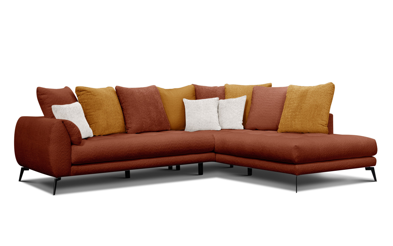 Ecksofa 5-Sitzer CALME, dunkelorange und écru - Beschreibung:Das außergewöhnliche Ecksofa 5-Sitzer CALME, dunkelorange und écru ist ein visuelles Meisterwerk, das mit Kontrasten spielt und dabei eine harmonische, fast künstlerische Ausstrahlung besitzt. Die Kombination aus dem warmen, erdigen Dunkelorange und dem frischen, hellen Écru verleiht diesem Möbelstück eine Lebendigkeit, die jeden Wohnraum sofort aufwertet. Der angesagte Bouclé-Stoff mit seiner weichen, strukturierten Oberfläche verbindet die beiden Farben haptisch und macht das Sofa zu einem wahren Genuss für die Sinne. Es ist ein Design für Menschen, die das Besondere suchen und Mut zur Individualität haben. Dieses zweifarbige Konzept sorgt für Spannung und Dynamik. Das helle Écru bringt Licht und Leichtigkeit, während das Dunkelorange für Wärme und Tiefe sorgt. Zusammen ergeben sie auf dem Ecksofa 5-Sitzer CALME, dunkelorange und écru ein Bild von moderner Gemütlichkeit. Die Textur des Stoffes verstärkt diesen Effekt noch, indem sie das Licht bricht und die Farben weicher und natürlicher erscheinen lässt. Es ist ein Möbelstück, das nicht nur funktional ist, sondern den Raum gestaltet und strukturiert. Als 5-Sitzer bietet es luxuriösen Platz für die ganze Familie. Doch dank der geschickten Farbaufteilung und der schlanken Silhouette wirkt es niemals wuchtig. Das Ecksofa 5-Sitzer CALME, dunkelorange und écru lädt dazu ein, sich fallen zu lassen, die weichen Materialien zu spüren und in eine Welt der Entspannung einzutauchen. Es ist der perfekte Ort, um Energie zu tanken und sich wohlzufühlen. Warum das Ecksofa 5-Sitzer CALME, dunkelorange und écru Ihr Zuhause perfektioniertDas Design dieses Sofas ist eine Hommage an den modernen Eklektizismus. Die klare Form des Korpus wird durch die weichen, fast zufällig wirkenden Kissenarrangements aufgebrochen, was dem Ecksofa 5-Sitzer CALME, dunkelorange und écru einen lässigen Charme verleiht. Die geschwungenen Armlehnen fügen eine sanfte, organische Linie hinzu, die im Kontrast zu den geraden Metallfüßen steht. Dieses Spiel mit Formen und Farben macht das Sofa zu einem echten Hingucker. Die Farbkombination ermöglicht vielfältige Styling-Optionen. Sie können Accessoires in beiden Farbfamilien wählen oder mit neutralen Tönen arbeiten, um das Sofa wirken zu lassen. Die schwarzen Füße heben das Möbelstück elegant an, schaffen Bodenfreiheit und erleichtern die Reinigung. Das Ecksofa 5-Sitzer CALME, dunkelorange und écru ist somit nicht nur ein ästhetisches Highlight, sondern auch praktisch und alltagstauglich konzipiert. Der Bouclé-Stoff ist bekannt für seine Langlebigkeit und seine unempfindliche Art. Er knittert nicht und behält seine flauschige Struktur auch bei täglicher Nutzung. Das bedeutet, dass Ihr Ecksofa 5-Sitzer CALME, dunkelorange und écru auch nach langer Zeit noch so exquisit aussieht wie am ersten Tag. Es ist eine Investition in Qualität und Stil, die sich jeden Tag aufs Neue auszahlt. Pure Entspannung und Sitzkomfort auf dem Ecksofa 5-Sitzer CALME, dunkelorange und écruKomfort ist bei diesem Sofa keine Option, sondern Standard. Die Sitzfläche besteht aus mehreren Schaumstoffschichten unterschiedlicher Dichte, die perfekt aufeinander abgestimmt sind. Sie bieten festen Halt und gleichzeitig eine angenehme Weichheit, die den Körper umschmeichelt. Das Sitzen auf dem Ecksofa 5-Sitzer CALME, dunkelorange und écru ist pure Entspannung und lässt Sie den Stress des Tages vergessen. Ein absoluter Traum sind die Rückenkissen, die mit speziellen Silikonfasern gefüllt sind. Diese sorgen für ein unglaublich weiches Anlehnen und passen sich Ihrer Körperform individuell an. Sie können die Kissen so platzieren, wie es für Sie am besten ist, und sich Ihre eigene Komfortzone schaffen. Das Ecksofa 5-Sitzer CALME, dunkelorange und écru bietet somit ergonomische Vorteile verpackt in luxuriösem Design. Die großzügige Ottomane lädt zum langen Verweilen ein. Ob für ein kurzes Nickerchen oder einen langen Leseabend – hier finden Sie die nötige Ruhe. Die Kombination aus visueller Wärme und physischem Komfort macht dieses Sofa einzigartig. Gönnen Sie sich mit dem Ecksofa 5-Sitzer CALME, dunkelorange und écru ein Stück Lebensqualität, das Sie begeistern wird. |