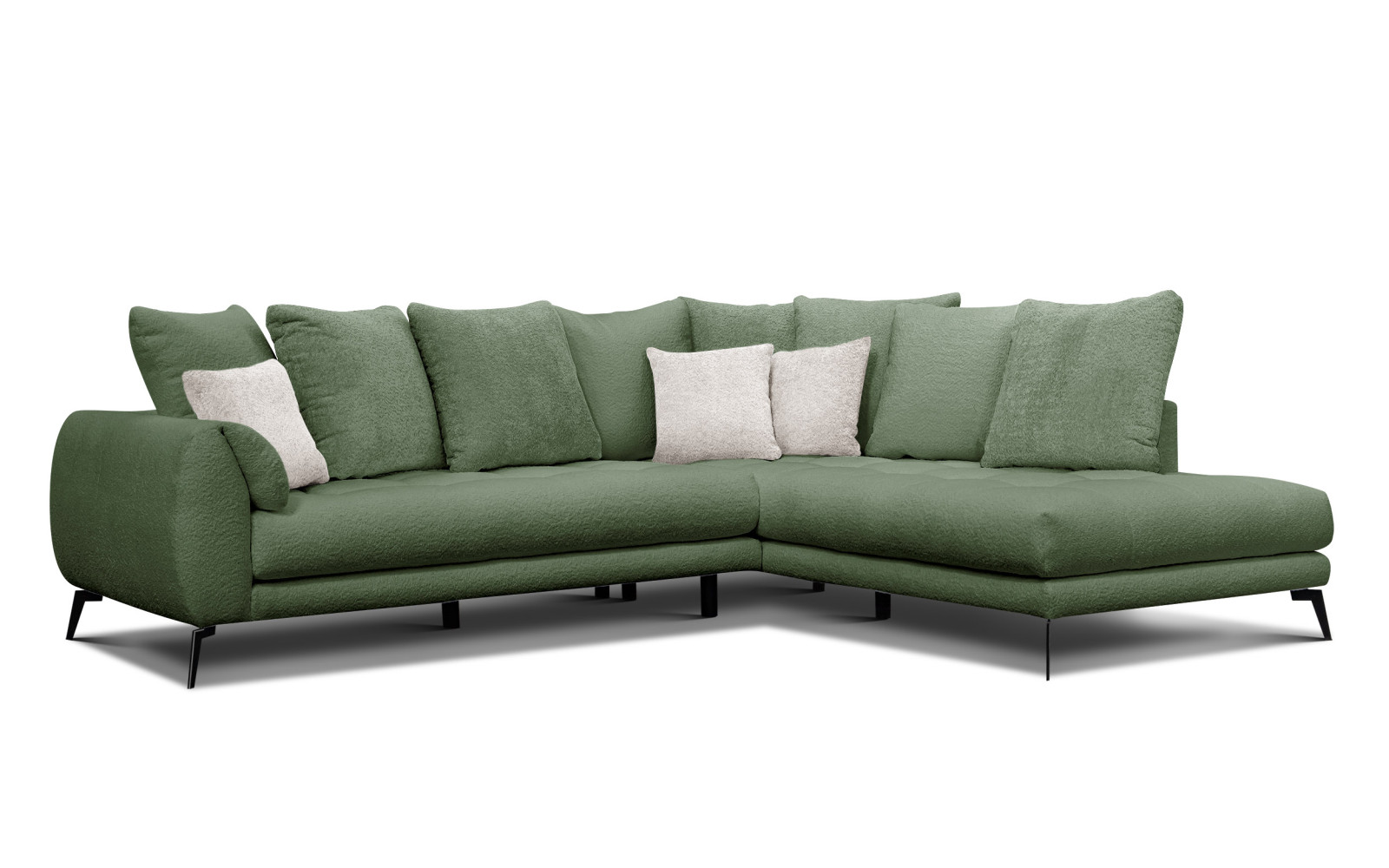 Ecksofa 5-Sitzer CALME, olive - Beschreibung:Wenn Sie Ihren Wohnraum in eine Oase der Ruhe verwandeln möchten, ist das Ecksofa 5-Sitzer CALME, olive eine unvergleichlich elegante Wahl. Dieses exquisite Möbelstück verkörpert modernen Minimalismus, der auf eine außergewöhnlich weiche Haptik trifft. Schon beim ersten Anblick zieht der satte Olivton die Blicke auf sich und bringt eine natürliche, erdende Atmosphäre in jedes Zimmer. Der Bezug aus hochwertigem Bouclé-Stoff mit seiner klaren Textur ist nicht nur optisch ein Highlight, sondern auch ein haptischer Genuss für die Sinne. Die flauschige Oberfläche lädt dazu ein, mit der Hand darüberzustreichen und die Alltagssorgen zu vergessen. Das Design dieses Sofas spielt gekonnt mit Kontrasten. Während die Grundstruktur klar und fließend wirkt, sorgt die Vielzahl an losen Kissen für eine Optik, die pure Entspannung verspricht. Diese Kissen bilden eine weiche, fast gepolsterte Wand, in die man sich wunderbar hineinfallen lassen kann. Es ist diese Kombination aus strenger Linie und einladender Weichheit, die das Möbelstück so traumhaft macht. Das Ecksofa 5-Sitzer CALME, olive wird so zum unbestrittenen Mittelpunkt Ihres Wohnzimmers. Trotz seiner großzügigen Maße wirkt das Sofa dank der schlanken, 16 cm hohen Metallfüße in Schwarz erstaunlich leicht. Diese sorgen für eine optische Schwebe-Optik und erleichtern zudem die Reinigung unter dem Möbelstück erheblich. Die geschwungenen Linien der Armlehnen verleihen der Form eine zusätzliche Fluidität und bieten beim Anlehnen höchsten Komfort. Jedes Detail an diesem Bouclé Sofa ist darauf ausgelegt, Ästhetik und Bequemlichkeit zu vereinen. Warum das Ecksofa 5-Sitzer CALME, olive die perfekte Wahl für Ihr Zuhause istDie Entscheidung für das Ecksofa 5-Sitzer CALME, olive bedeutet, sich ein Stück Naturverbundenheit und modernen Chic in die eigenen vier Wände zu holen. Die Farbe Olive ist zeitlos und lässt sich hervorragend mit Hölzern, Metall oder hellen Textilien kombinieren. Sie strahlt eine souveräne Gelassenheit aus, die sich positiv auf das Raumklima auswirkt. Es ist ein Möbelstück, das nicht nur funktional ist, sondern auch emotional berührt. Dank des modularen Designs bietet diese große Ecklandschaft viel Platz für die ganze Familie oder entspannte Abende mit Freunden. Ob Sie liegen, sitzen oder lümmeln wollen – die Chaiselongue und die breiten Sitzflächen bieten für jede Position den idealen Raum. Die Schaumstoffschichten unterschiedlicher Dichte im Inneren garantieren dabei, dass Sie lange Freude an der Formstabilität haben werden, ohne auf das weiche Einsinken verzichten zu müssen. Ein weiterer Vorteil ist die Robustheit des Bouclé-Stoffes. Trotz seiner kuscheligen Anmutung ist das Material widerstandsfähig und pflegeleicht. Die Textur verzeiht kleine Unregelmäßigkeiten und bleibt auch bei intensiver Nutzung formschön. So bleibt Ihr Wohnzimmer stets repräsentativ und gemütlich zugleich. Außergewöhnlicher Komfort durch Silikonfasern im Ecksofa 5-Sitzer CALME, oliveWas das Ecksofa 5-Sitzer CALME, olive von herkömmlichen Sofas unterscheidet, ist das Innenleben der Rückenkissen. Diese sind mit hochwertigen Silikonfasern gefüllt, was einen Sitzkomfort der Extraklasse ermöglicht. Sie passen sich der Körperform perfekt an und bieten eine Unterstützung, die sich wie eine sanfte Umarmung anfühlt. Dies ist pure Entspannung auf Knopfdruck – oder besser gesagt, beim bloßen Hinsetzen. Die Möglichkeit, die Kissen individuell zu arrangieren, erlaubt es Ihnen, Ihre persönliche Lieblingsposition zu finden. Ob Sie eine aufrechte Haltung zum Lesen bevorzugen oder sich tief in die Polster graben wollen, dieses Sofa macht alles mit. Die Kombination aus der festen Basis der Schaumstoffschichten und der flauschigen Weichheit der Kissen ist ergonomisch durchdacht und sorgt für langanhaltendes Wohlbefinden. Genießen Sie die Freiheit, die Ihnen dieses exquisite Möbelstück bietet. Es ist ein Rückzugsort, der Designanspruch und Gemütlichkeit in perfekter Harmonie vereint. |