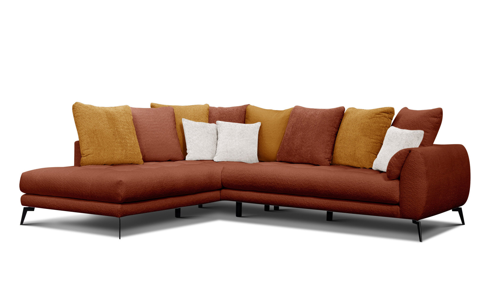 Ecksofa 5-Sitzer CALME, dunkelorange und écru - Beschreibung:Das Ecksofa 5-Sitzer CALME, dunkelorange und écru ist ein Meisterwerk der Kontraste und bringt eine unvergleichlich dynamische Atmosphäre in Ihr Zuhause. Die Kombination aus dem lebhaften, warmen Dunkelorange und dem beruhigenden, hellen Écru ist mutig und exquisit zugleich. Sie schafft ein visuelles Spannungsfeld, das modern und doch gemütlich wirkt. Der verwendete Bouclé-Stoff mit seiner klaren Textur verbindet die beiden Farben haptisch und sorgt für eine Oberfläche, die weich, flauschig und angenehm im Griff ist – ein echter Genuss für die Sinne. Die Philosophie der Calme-Serie, ungezwungenen Komfort mit moderner Ästhetik zu verbinden, wird hier perfekt umgesetzt. Die minimalistische Grundform des Sofas wird durch die vielen unterschiedlichen Kissen aufgelockert, die in den beiden Farben gehalten sind. Dies erzeugt Tiefe und lässt das Sofa wie eine einladende Lounge-Oase wirken. Es ist der perfekte Ort für pure Entspannung, umgeben von Farben, die Lebensfreude und Ruhe gleichermaßen ausstrahlen. Die geschwungenen Armlehnen runden das organische Design harmonisch ab. Ein weiteres Design-Highlight sind die schlanken, schwarzen Metallfüße. Mit ihrer Höhe von 16 cm lassen sie das großzügige Ecksofa optisch schweben und verleihen ihm eine Leichtigkeit, die in modernen Wohnräumen sehr gefragt ist. Diese Konstruktion verbessert nicht nur die Proportionen, sondern ist auch praktisch, da sie die Bodenreinigung unter dem Möbelstück enorm erleichtert. Warum das Ecksofa 5-Sitzer CALME, dunkelorange und écru die beste Wahl istWenn Sie ein Möbelstück suchen, das Charakter hat und nicht in der Masse untergeht, dann ist das Ecksofa 5-Sitzer CALME, dunkelorange und écru genau das Richtige für Sie. Es bringt Wärme in kühle Räume und setzt einen stilvollen Akzent, der Bewunderung hervorruft. Die Zweifarbigkeit ermöglicht vielfältige Kombinationsmöglichkeiten mit anderen Einrichtungsgegenständen, sei es in Naturtönen oder Schwarz-Weiß. Der Komfort kommt bei aller Designliebe nicht zu kurz. Das modulare Sofa bietet auf seiner großen Fläche Platz für die ganze Familie. Die Sitzfläche ist mit Schaumstoffschichten unterschiedlicher Dichte ausgestattet, was ein langlebiges und bequemes Sitzen garantiert. Sie sinken sanft ein, ohne den Halt zu verlieren – eine Qualität, die man spürt. Der Bouclé-Stoff ist bekannt für seine Unempfindlichkeit gegenüber Knittern und seine Robustheit. Er fühlt sich nicht nur toll an, sondern sieht auch nach Jahren noch attraktiv aus. Die Struktur des Stoffes trägt dazu bei, dass das Sofa immer wohnlich wirkt. Traumhafter Komfort durch Silikonfasern im Ecksofa 5-Sitzer CALME, dunkelorange und écruDas Herzstück des Komforts sind die mit Silikonfasern gefüllten Rückenkissen. Diese innovative Füllung sorgt für eine außergewöhnliche Weichheit, die an Daunen erinnert, aber formstabiler ist. Sich hier anzulehnen bedeutet, sofortigen Stressabbau zu erleben. Die Kissen schmiegen sich an den Rücken an und bieten Unterstützung genau dort, wo sie gebraucht wird. Die losen Kissen bieten Ihnen die Freiheit, Ihre Sitzlandschaft individuell zu gestalten. Egal ob Sie lesen, schlafen oder reden möchten – Sie finden immer die perfekte Position. Dieses Sofa verbindet ergonomischen Sitzkomfort mit einer kuscheligen Weichheit, die traumhaft ist. Erleben Sie, wie dieses Sofa Ihr Wohnzimmer in einen Ort der Inspiration und der Ruhe verwandelt. |