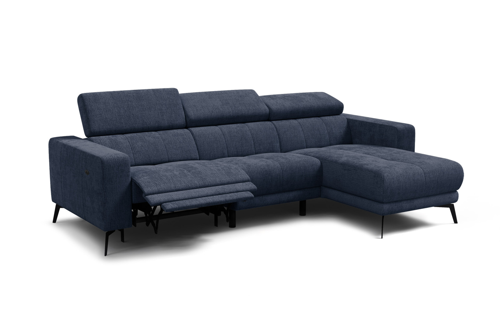 Ecksofa 4-Sitzer MORELLO in marineblauem Chenille-Stoff, weich im Griff und strapazierfähig (45.000 Martindale), für langlebigen Komfort und ein angenehmes Sitzgefühl.