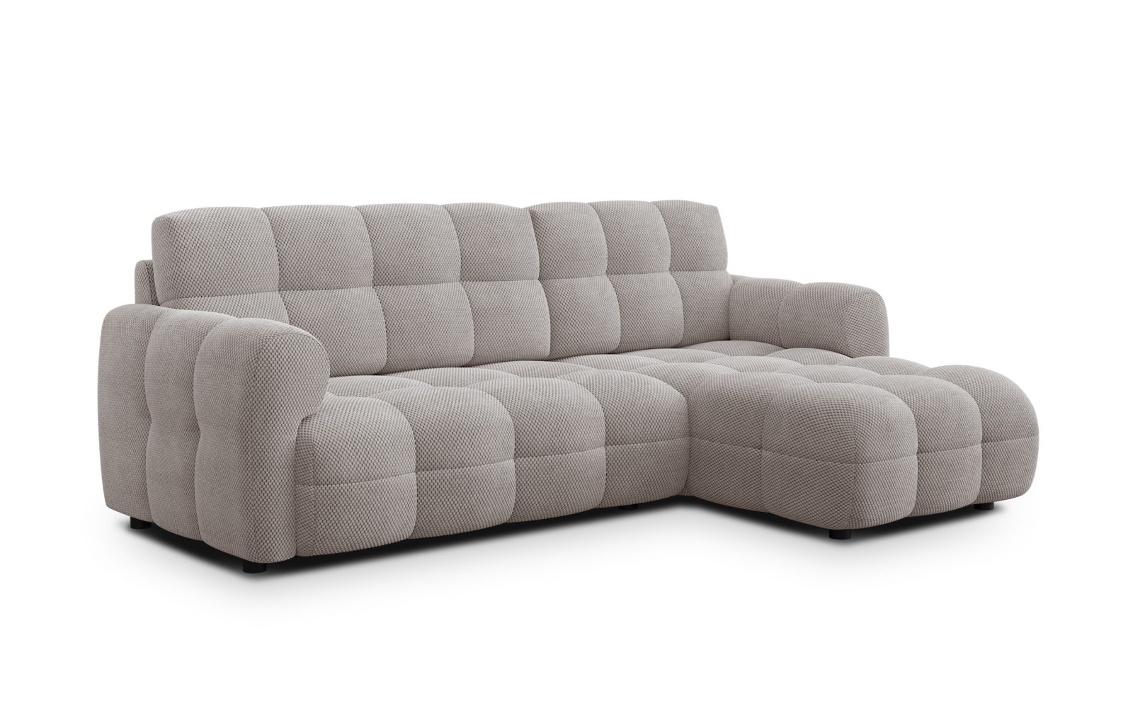 Besonders exquisit wird dieses Modell durch den verwendeten Waffelstoff. Die dreidimensionale Struktur aus kleinen Würfeln gibt dem beigen Stoff eine faszinierende Tiefe und Haptik. Es ist kein glatter, kühler Stoff, sondern ein Gewebe mit Charakter, das sich außergewöhnlich weich und griffig anfühlt. Wenn Sie mit der Hand darüber streichen, spüren Sie die Qualität und die wohlige Textur, die das Ecksofa 3-Sitzer rechts MELLOW, beige zu einem echten Genuss für die Sinne macht.