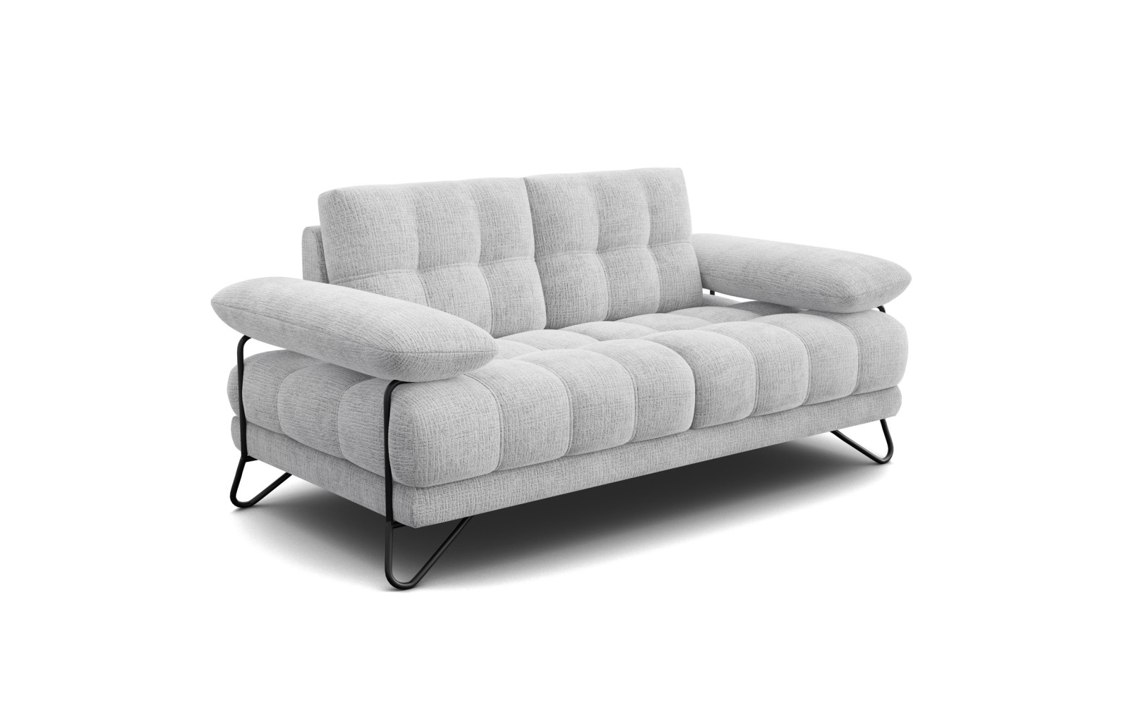 Der wahre Blickfang dieses Modells sind jedoch die Füße. Die schwarzen, metallenen Beine sind in einer außergewöhnlichen Schleifenform gestaltet, die dem Sofa einen unverwechselbaren industriellen Touch verleiht. Sie heben den Korpus elegant an und sorgen für eine visuelle Leichtigkeit, als würde das Polstermöbel im Raum schweben. Dieser Kontrast zwischen dem weichen, hellen Stoff und dem kühlen, dunklen Metall ist absolut exquisit.