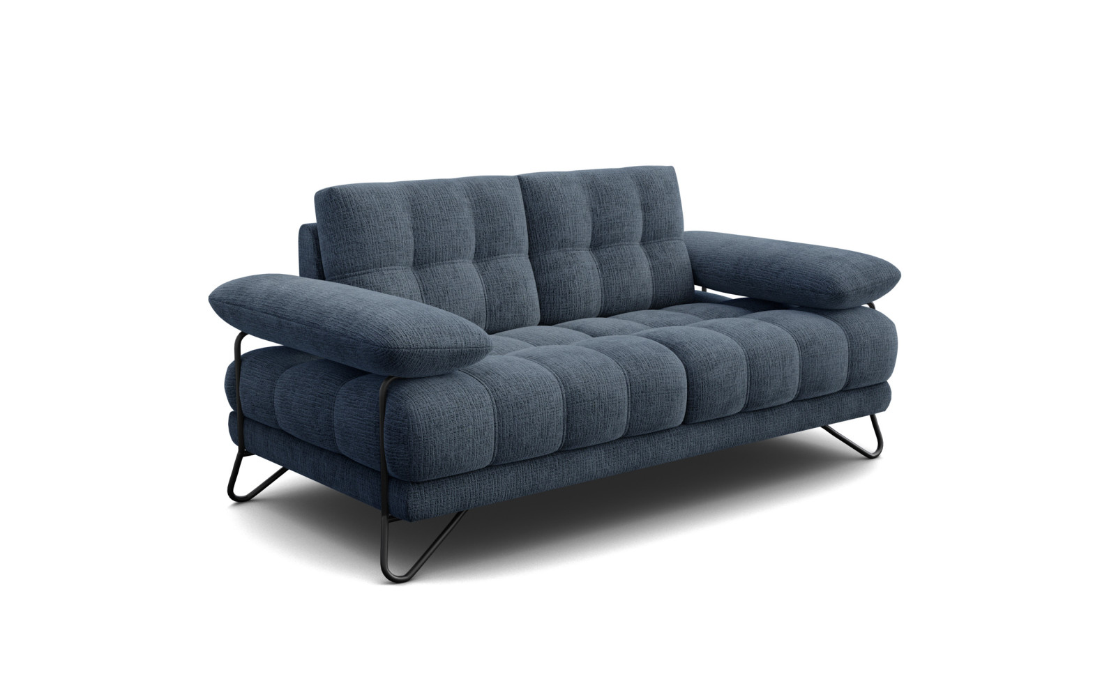 Ein besonderer Hingucker sind die schwarzen Metallbeine in Schleifenform. Sie verleihen dem Sofa einen modernen Loft-Charakter und heben den Korpus elegant an. Dieser Kontrast zwischen dem tiefblauen, weichen Stoff und dem kühlen, schwarzen Metall ist absolut stilsicher und modern. Die Beine sorgen zudem für Bodenfreiheit, was den Raum optisch größer wirken lässt.