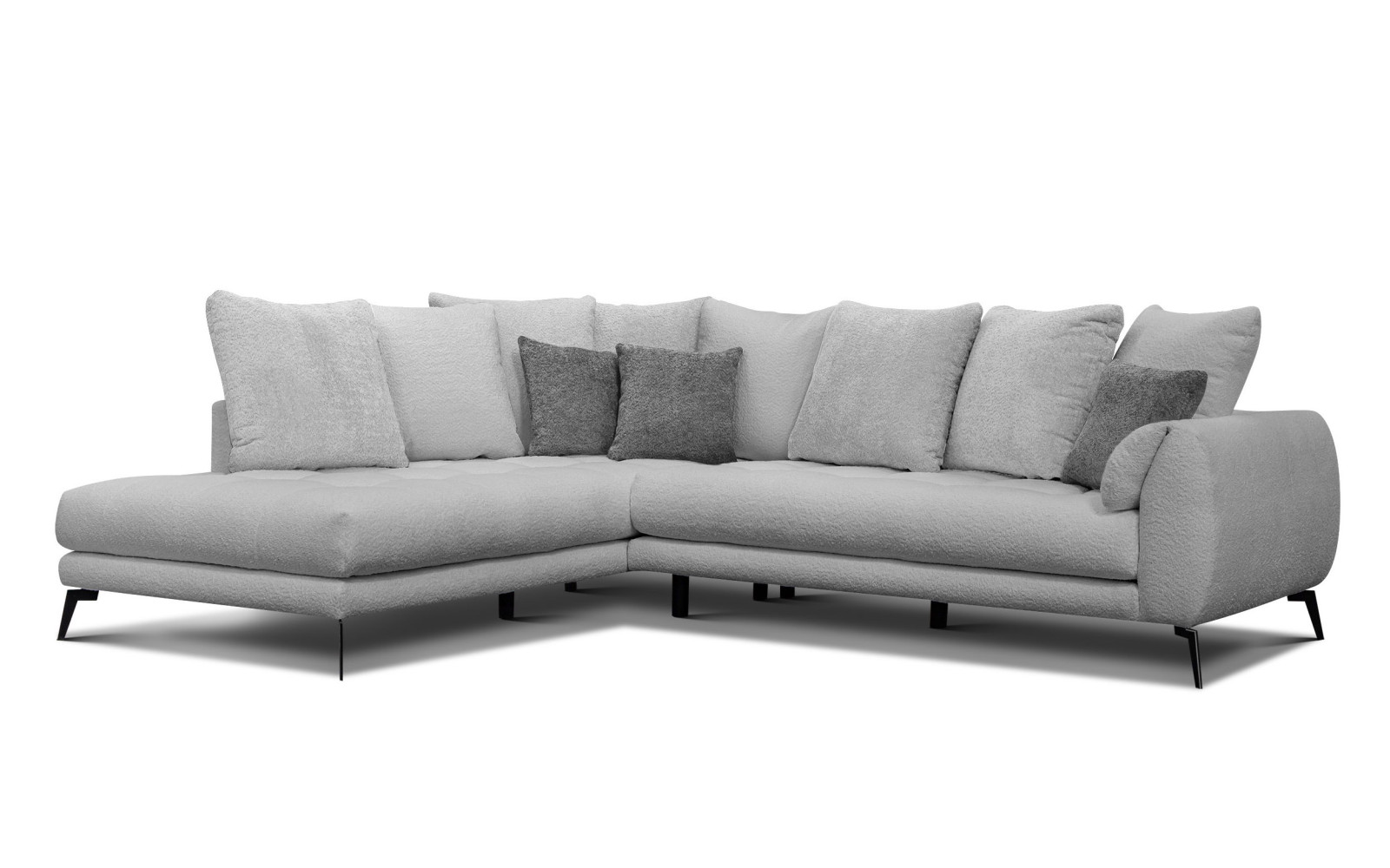 Ecksofa 5-Sitzer CALME, hellgrau - Beschreibung:Für Liebhaber zeitloser Eleganz und modernen Designs ist das Ecksofa 5-Sitzer CALME, hellgrau eine unvergleichlich gute Wahl. Hellgrau ist der Klassiker unter den Wohnfarben, weil es Ruhe ausstrahlt, sich jedem Stil anpasst und niemals aus der Mode kommt. Doch dieses Sofa ist alles andere als gewöhnlich. Der Bezug aus trendigem Bouclé-Stoff verleiht der schlichten Farbe eine aufregende, klare Textur. Die Oberfläche ist weich, flauschig und angenehm im Griff, was das Sofa zu einem echten Genuss für die Sinne macht und ihm eine besondere Wertigkeit verleiht. Die Calme-Serie steht für die Verbindung von minimalistischer Form und maximaler Gemütlichkeit. Die klare Linienführung des Korpus bildet einen spannenden Kontrast zu den vielen weichen Kissen, die eine Art gepolsterte Wand formen. Dieser ungezwungene Komfort lädt dazu ein, die Schuhe auszuziehen und pure Entspannung zu finden. Die geschwungenen Armlehnen nehmen die Strenge aus dem Design und sorgen für einen fließenden Übergang, der das Auge beruhigt. Unterstützt wird die moderne Optik durch die 16 cm hohen, schwarzen Metallfüße. Sie sind schlank und filigran, was dem großen 5-Sitzer eine beeindruckende Leichtigkeit verleiht. Das Sofa wirkt nicht wuchtig, sondern elegant und luftig. Zudem ist die Bodenfreiheit ein praktischer Vorteil, der die Reinigung des Bodens unter dem Sofa zum Kinderspiel macht. Warum das Ecksofa 5-Sitzer CALME, hellgrau perfekt in Ihr Zuhause passtDas Ecksofa 5-Sitzer CALME, hellgrau ist ein wahres Chamäleon der Inneneinrichtung. Es passt perfekt in den Skandi-Style, harmoniert mit Industrial-Elementen oder fügt sich in ein klassisch-modernes Ambiente ein. Die helle Farbe lässt den Raum größer wirken und bietet die perfekte Bühne für farbige Plaids oder Kissen, wenn Sie Abwechslung wünschen. Es ist exquisit in seiner Schlichtheit und überzeugt durch Qualität. Der Sitzkomfort ist dank der Schaumstoffschichten unterschiedlicher Dichte hervorragend. Das Polster bietet die richtige Balance zwischen Einsinken und Stützen, was für langes, bequemes Sitzen entscheidend ist. Die Langlebigkeit der Materialien garantiert, dass das Sofa auch nach intensiver Nutzung seine Form behält und nicht durchgesessen wirkt. Bouclé ist als Stoff nicht nur wegen seiner Optik beliebt, sondern auch wegen seiner praktischen Eigenschaften. Er ist knitterarm und robust. Die strukturierte Oberfläche verzeiht vieles und sorgt dafür, dass das Sofa stets einladend und gemütlich aussieht. Außergewöhnlicher Komfort durch Silikonfasern im Ecksofa 5-Sitzer CALME, hellgrauEin Highlight dieses Sofas sind die Rückenkissen, die mit hochwertigen Silikonfasern gefüllt sind. Diese Füllung sorgt für einen traumhaft weichen Anlehnkomfort, der sich perfekt an Ihren Rücken anschmiegt. Es ist ein Gefühl von Geborgenheit, das man sofort spürt. Die Kissen sind lose und können nach Belieben arrangiert werden, um die perfekte Relaxposition zu finden. Diese Flexibilität macht das Sofa zum idealen Ort für alle Aktivitäten, vom entspannten Fernsehabend bis zum Mittagsschlaf. Die Kombination aus der stabilen Basis und der weichen Lehne ist ergonomisch durchdacht und bietet pure Erholung. Holen Sie sich mit diesem Sofa ein Stück zeitlose Schönheit und ultimativen Komfort in Ihr Wohnzimmer. Es wird schnell zum Lieblingsplatz der ganzen Familie. |