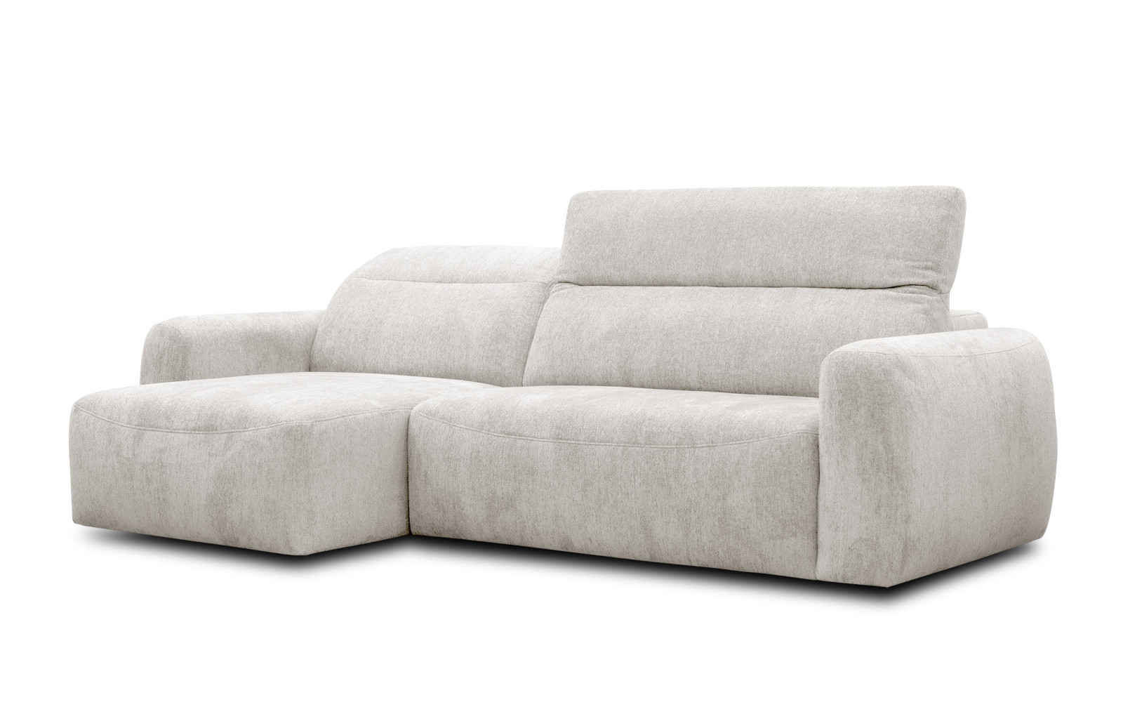 Ecksofa 4-Sitzer NERO in weichem, elegantem ecru Velours (50.000 Martindale), dessen zarte Textur je nach Lichteinfall einen subtilen Farbwechsel-Effekt erzeugt.