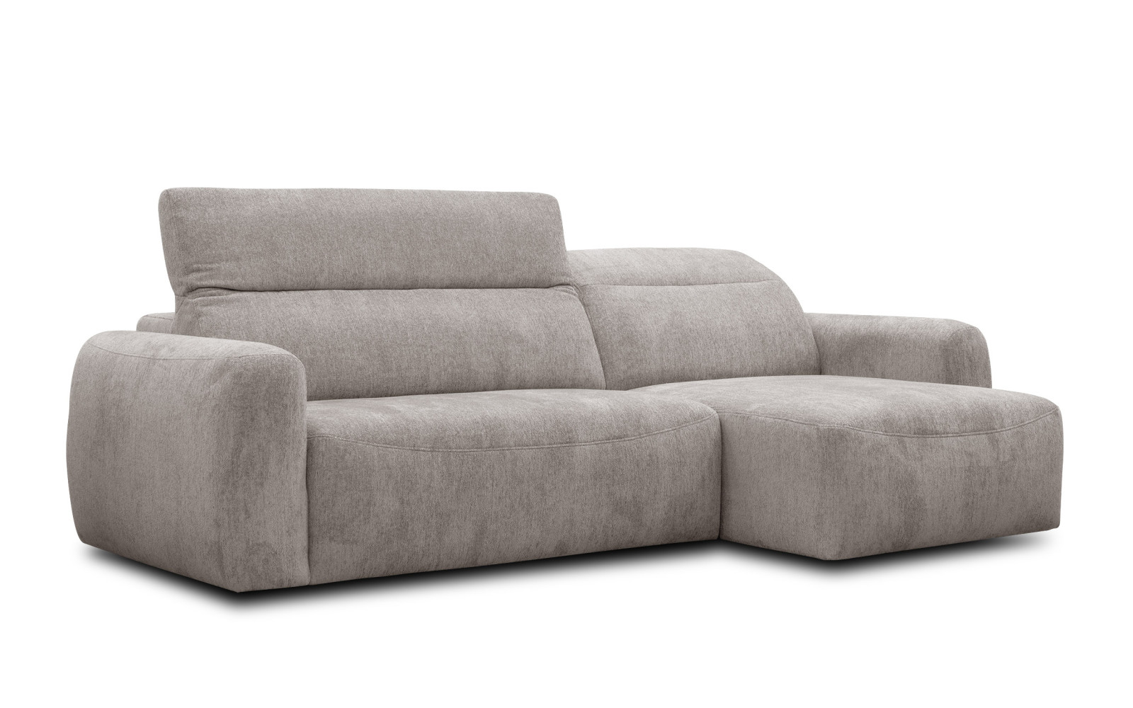 Ecksofa 4-Sitzer NERO in weichem, elegantem dunkelbeigem Velours (50.000 Martindale), dessen zarte Textur je nach Lichteinfall einen subtilen Farbwechsel-Effekt erzeugt.