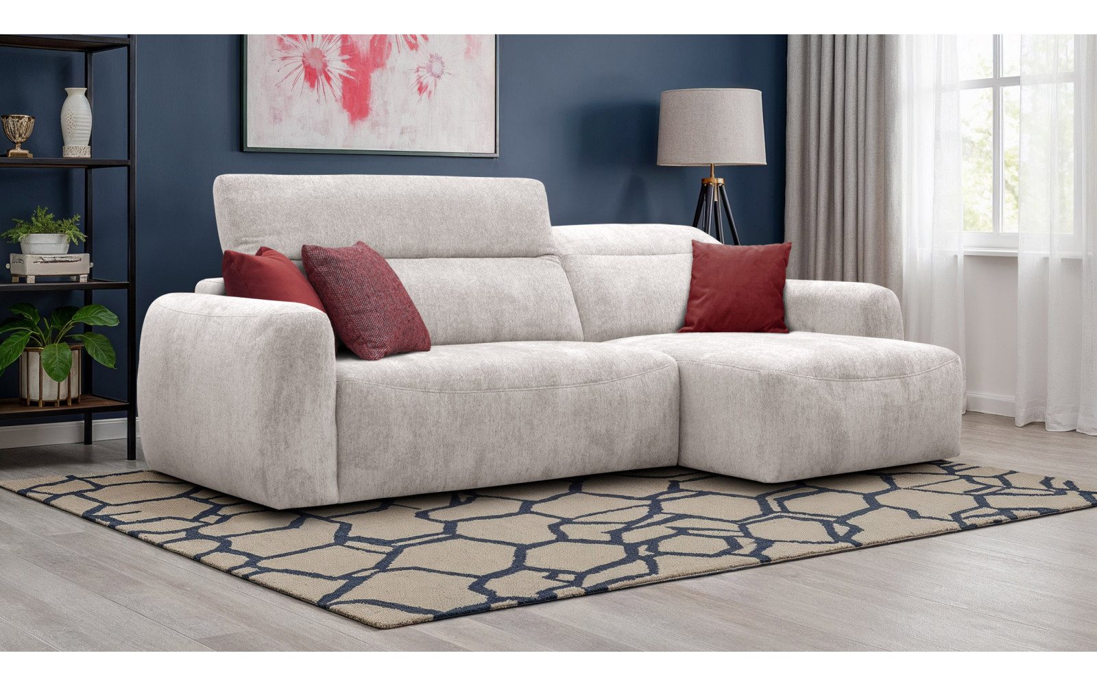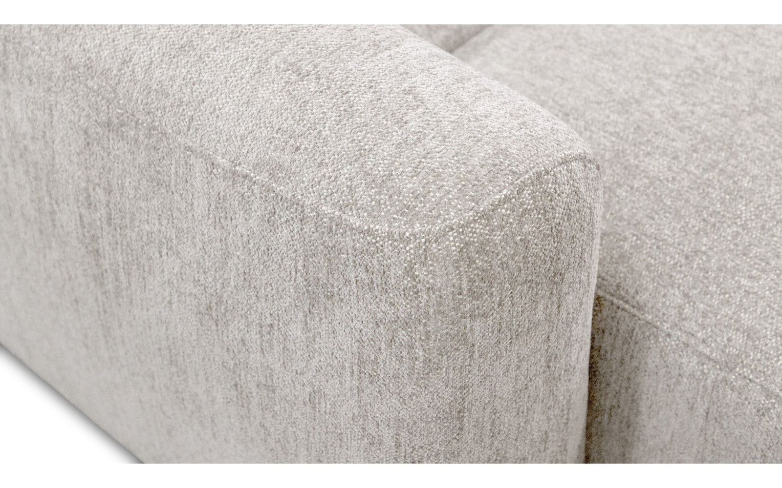 Ecksofa 4-Sitzer NERO in weichem, elegantem ecru Velours (50.000 Martindale), dessen zarte Textur je nach Lichteinfall einen subtilen Farbwechsel-Effekt erzeugt.