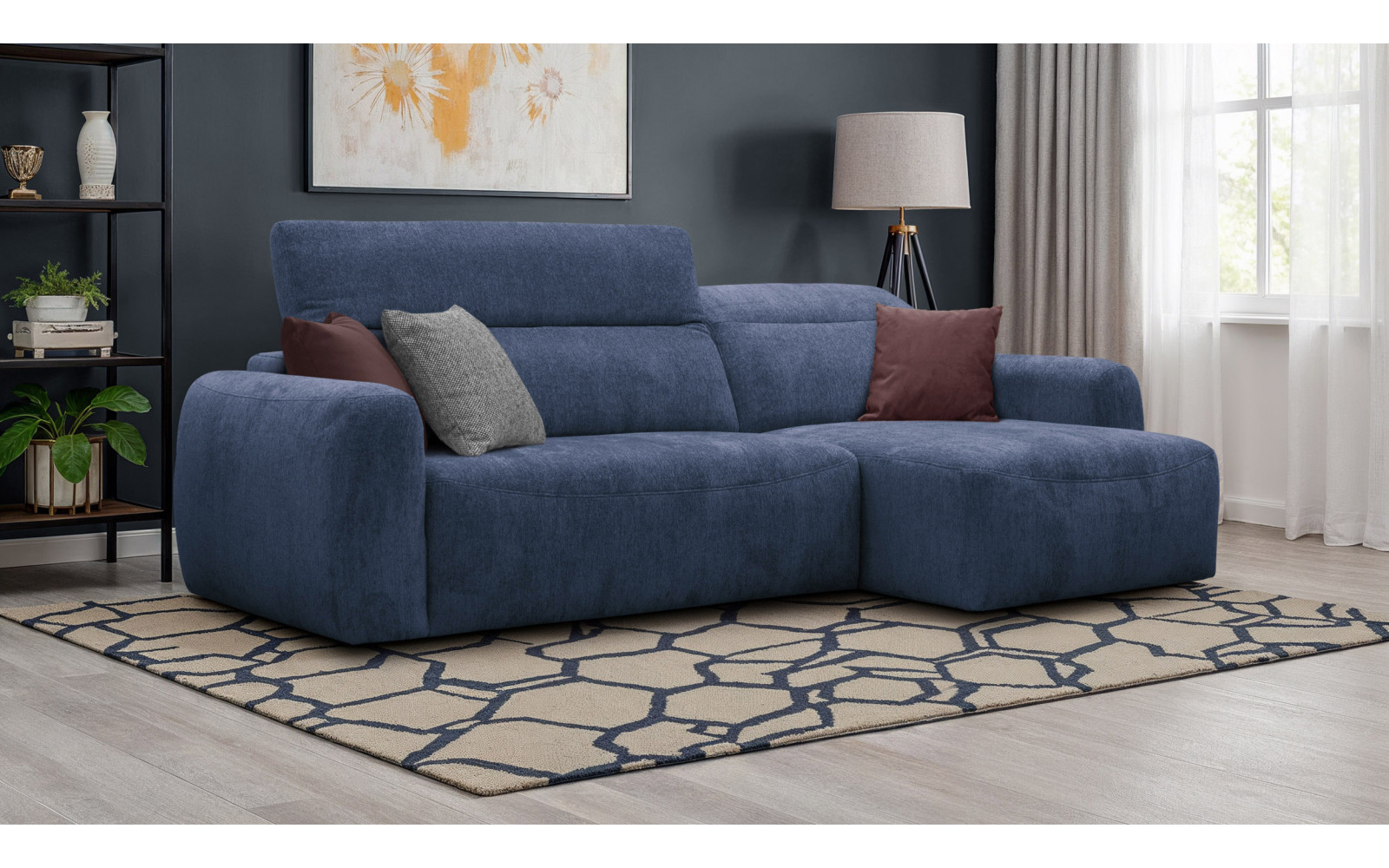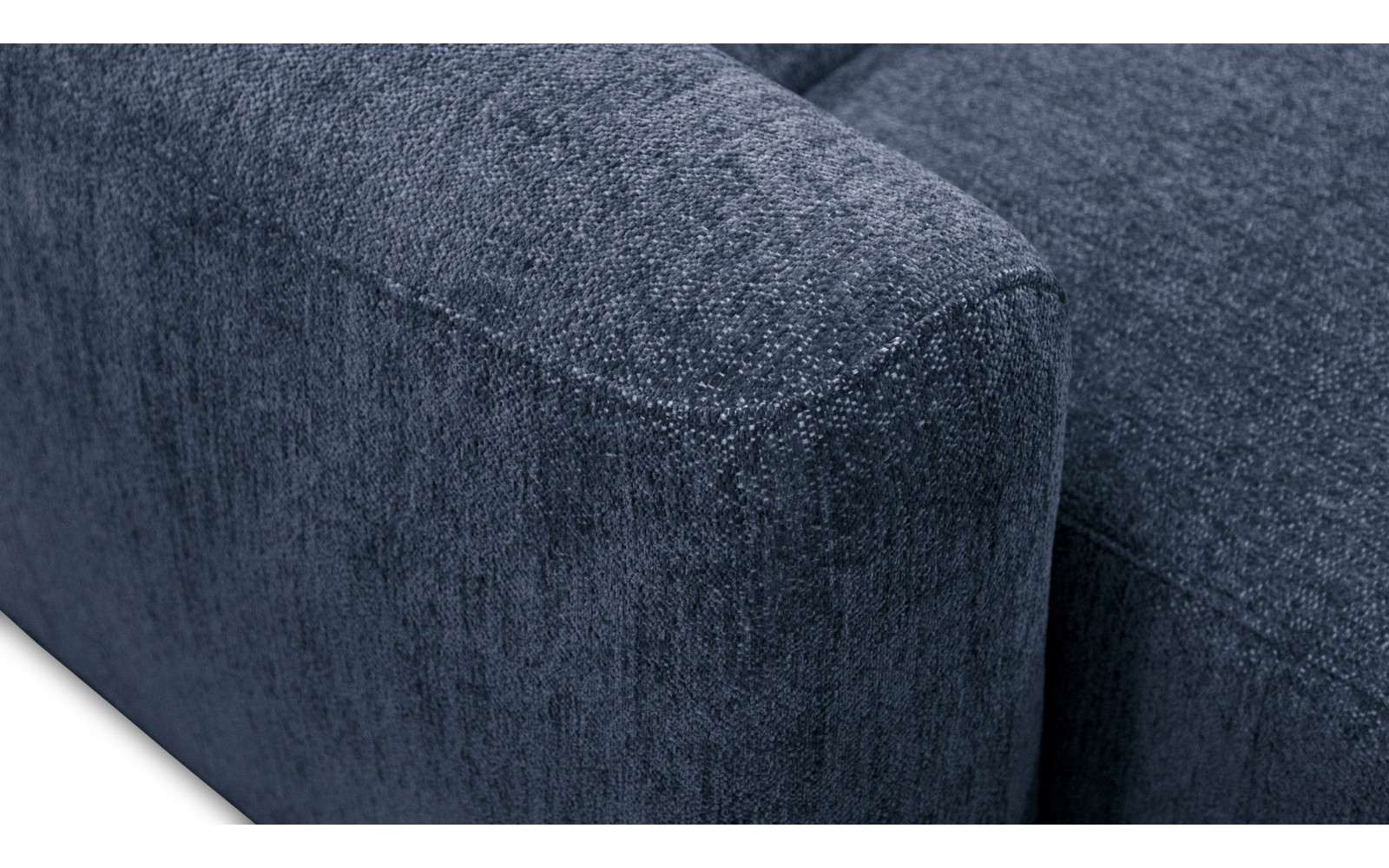 Ecksofa 4-Sitzer NERO in weichem, elegantem dunkelblauem Velours (50.000 Martindale), dessen zarte Textur je nach Lichteinfall einen subtilen Farbwechsel-Effekt erzeugt.